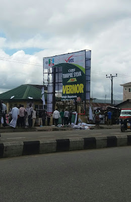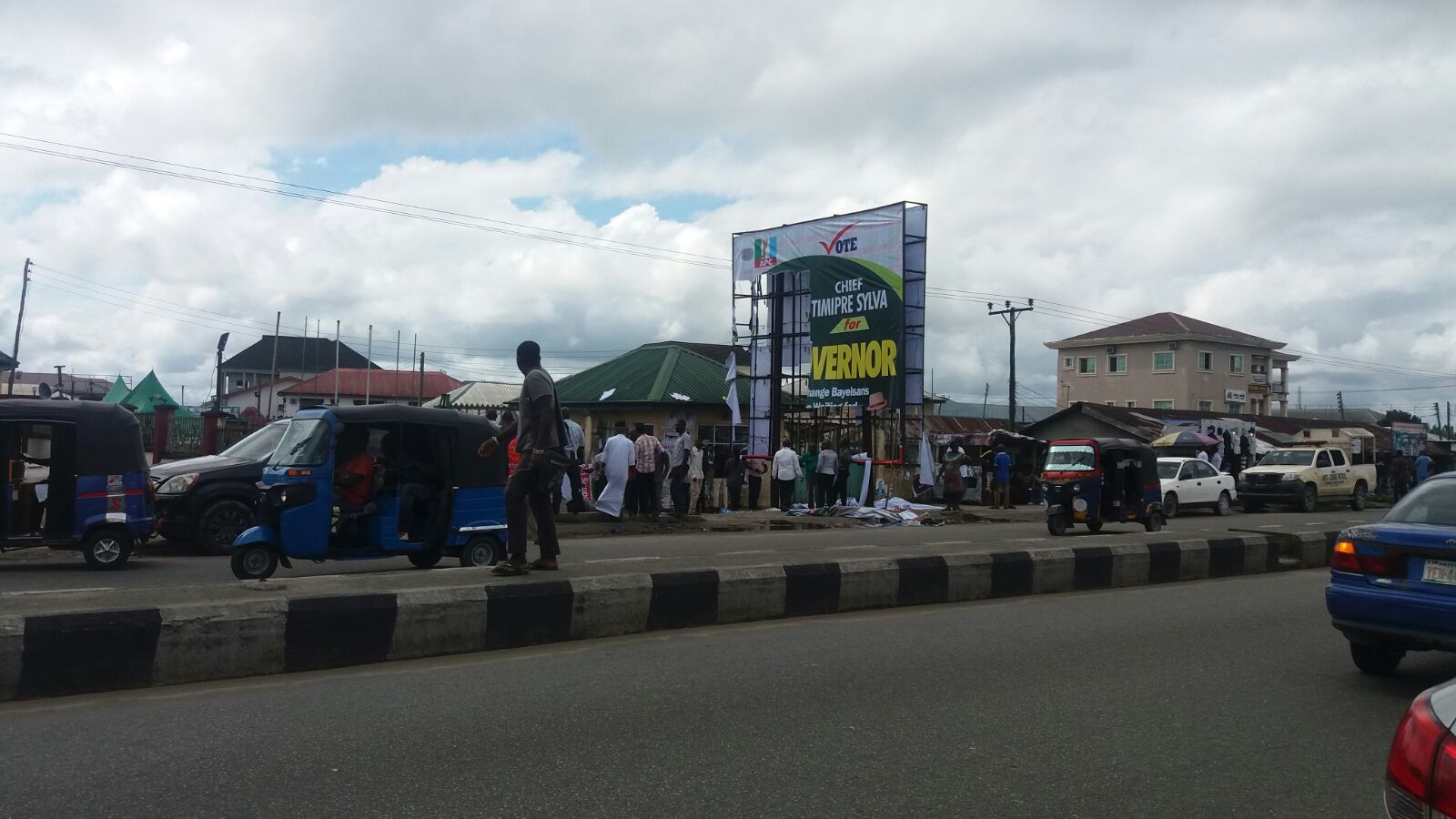 Home Uncategorized PHOTONEWS: Angry Supporters of Bayelsa APC Chairman Destroys Sylvas Campaign Banner