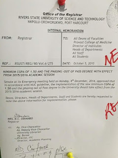 The Senate of the Rivers State University of Science and Technology has increases its Withdrawal For Academic Failure(WAF) Mark from the the normal 1.00 Cumulative Grade Percentage Average(CGPA) to 1.50 CGPA with effect from from the 2015/2016 academic session.