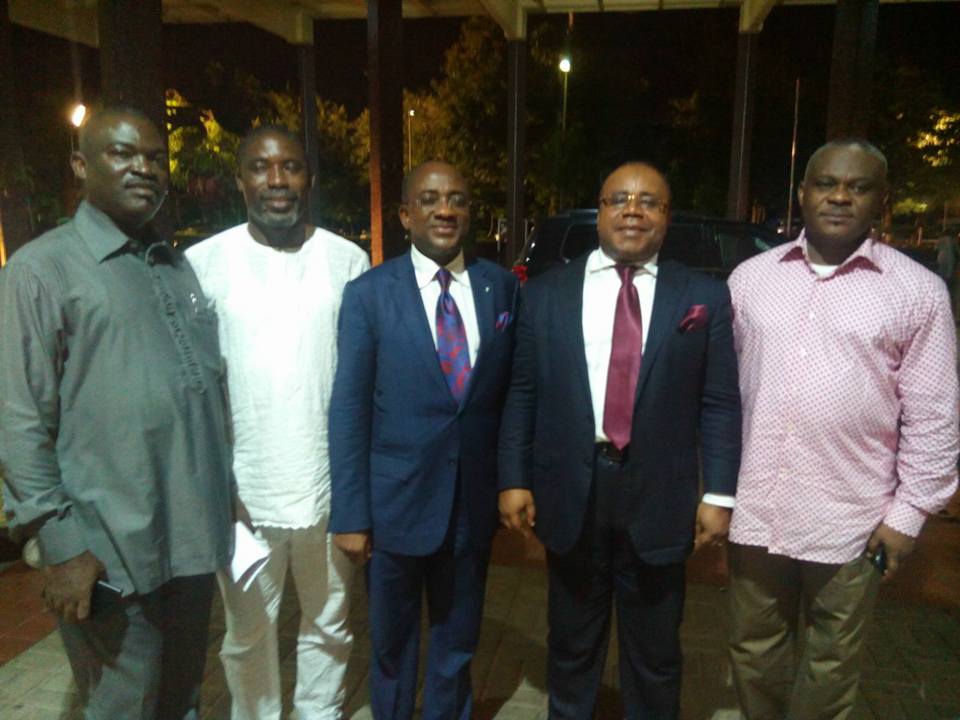 Governorship candidate of the All Progressives Congress (APC) in Akwa Ibom State, Obong Umana Okon Umana with his dear wife, Florence Umana, his ebullient lead counsel, Chief Wole Olanipekun, SAN, APC deputy governorship candidate, Engr. Benedict Ukpong and his dear wife, Akwa Ibom APC Chairman Dr. Amadu Antai, Inibehe Okorie, head of research of the legal team Barr. Effiong Oquong and others during a banquet at Sheraton Hotel & Towers in Abuja last night to celebrate the victorious end of sitting by the Tribunal.