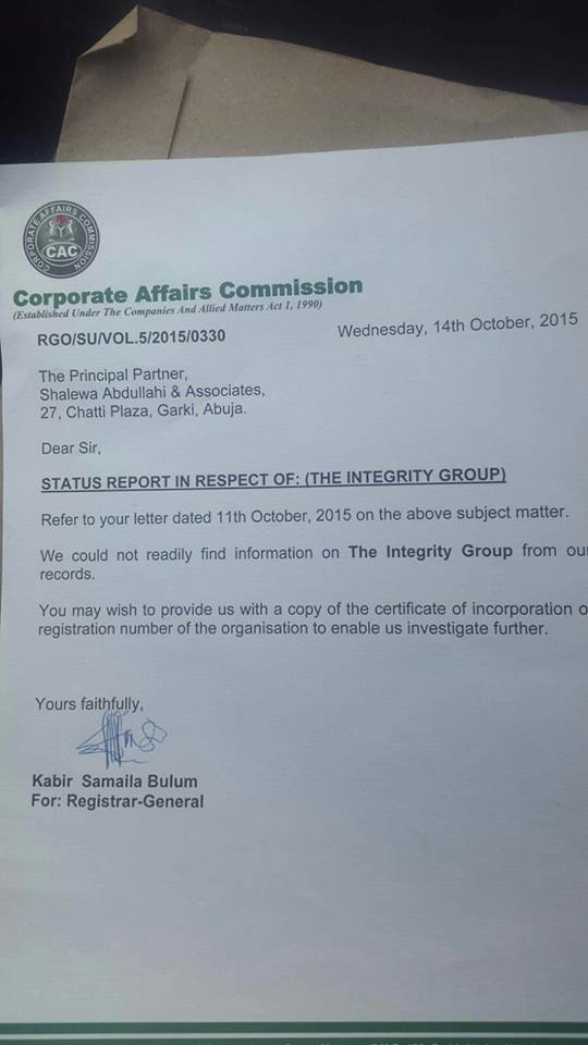 This development which has already increased tension in the city of Porharcourt was made known through a letter of enquiry sent to the Corporate Affairs Commision about the legality of the INTEGRITY GROUP ,since the Media Director has continued to use it as a tool for blackmail.