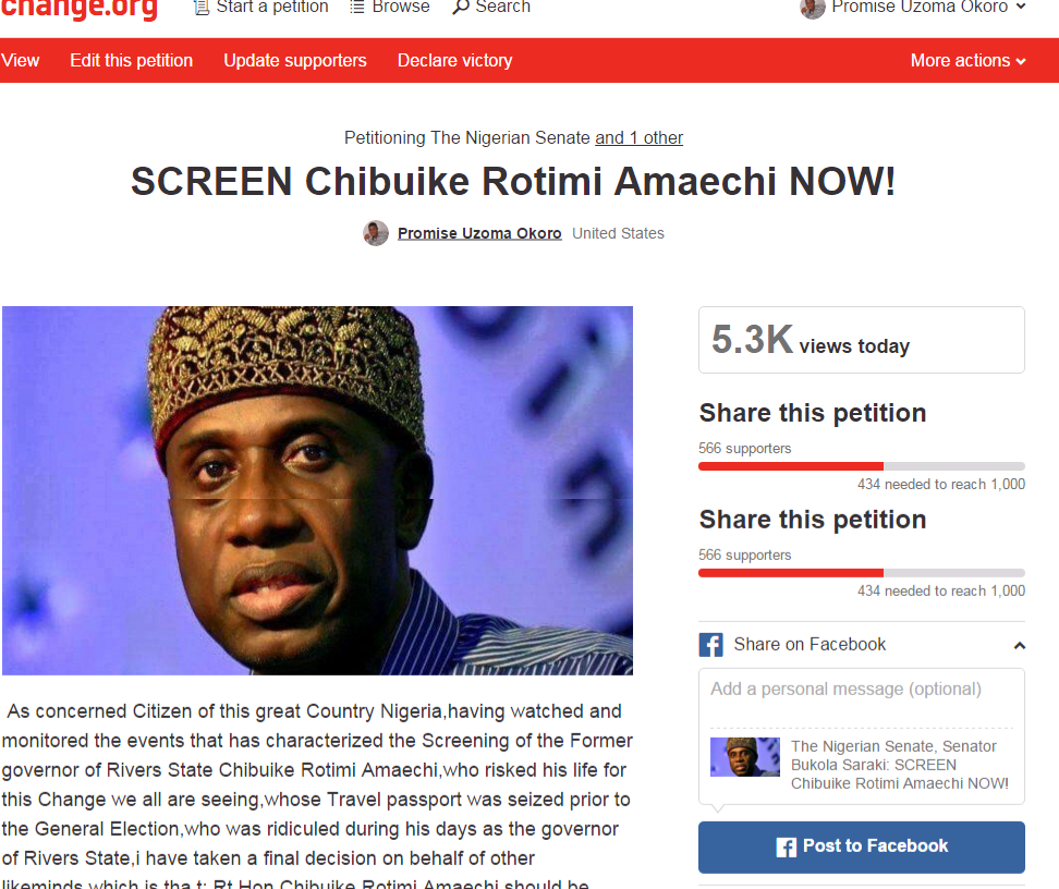 A visit to the LINK of the petition at https://www.change.org/p/the-nigerian-senate-senator-bukola-saraki-screen-chibuike-rotimi-amaechi-now showed that more Nigerians are willing and ready to stand by the former Rivers State Governor Chibuike Rotimi Amaechi