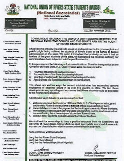 National Union Of Rivers State Students (NURSS) has issued a seven Days ultimatum to the governor of Rivers State Barr.Nyesom Wike to look into the plights of the Rivers State Students orthe union will mobilize its members to go ona mass Protest accross the State