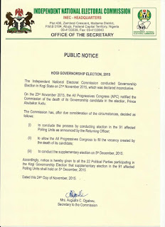 Inec also made known of their intention to conduct a supplementary election on Saturday 5th december