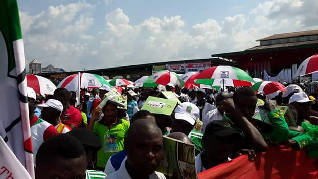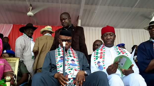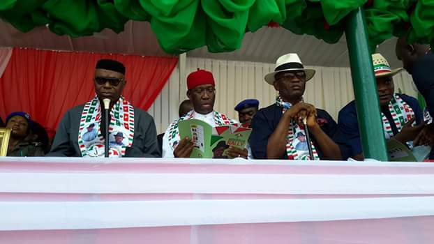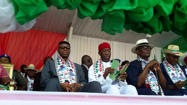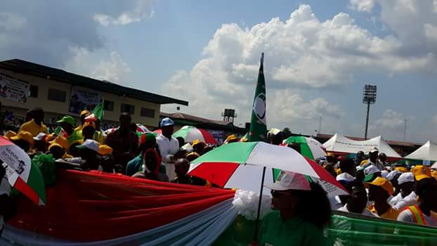 Former Nigerian President Dr Good luck Jonathan, Chairman of PDP Governors Forum and governor of Ondo State Dr Olusegun Mimiko,governor of Delta State Dr IFEANYI Okowa and other PDP Governors and leaders today graced the final campaign rally of Governor Seriake Dickson in Yenagoa