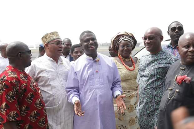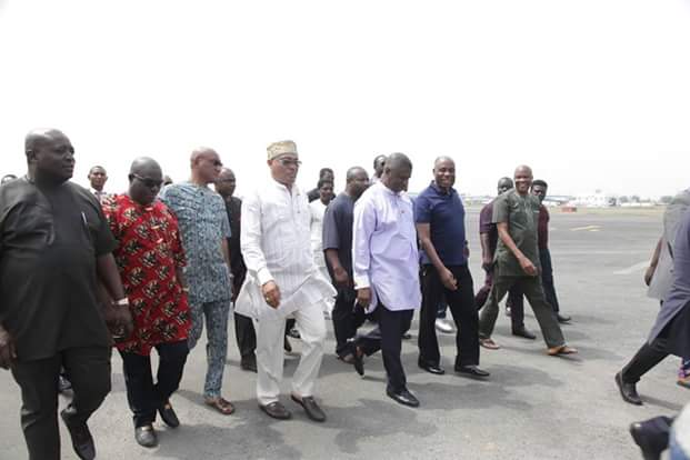 Minister of Transportation Mr Chibuike Amaechi today stormed Rivers State for An undisclosed engagement in Porharcourt he was received at the airport by the Governorship candidate of the All Progressives Congress in Rivers State Dr Dakuku Peterside, APC Chairman in the state Mr Davies Ikanya among others
