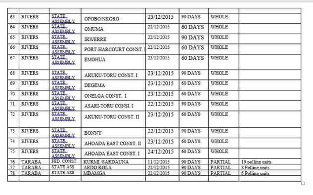 The Independent National Electoral Commission has released details of places were rerun elections will Hold in Rivers State, in the memo released by INEC the body will conduct rerun election in Three Senatorial Districts, Twelve Federal House of Representatives Constituencies and Twenty three State Constituencies.
