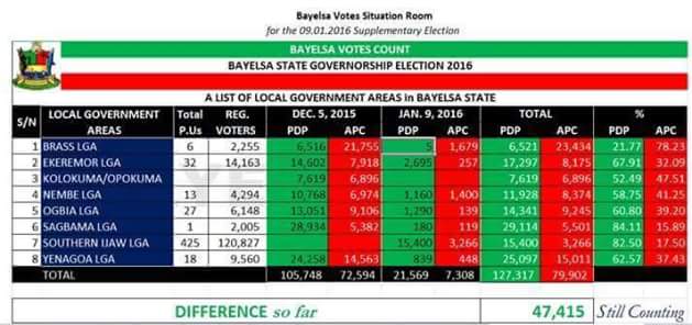 Although the candidate of the Peoples Democratic Party Governor Seriake Dickson is still leading in the Poll, indications has emerged that the results coming from Southern Ijaw is not friendly to the Peoples Democratic Party