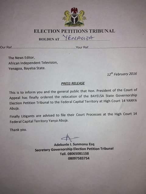 President of the Court of Appeal Justice Justice Zainab Adamu Bulkachuwa has ordered the re-location of the Bayelsa State Election petition Tribunal which was earlier scheduled to hold in Yenagoa,the Bayelsa State capital to Court 14 Inyanya of the Federal Capital Territory.