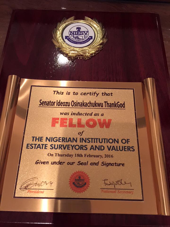 Nigerian Institution of Estate Surveyors and Valuers stated that Senator Osinakachukwu Tremendous Achievement prompted the Award given to Him.