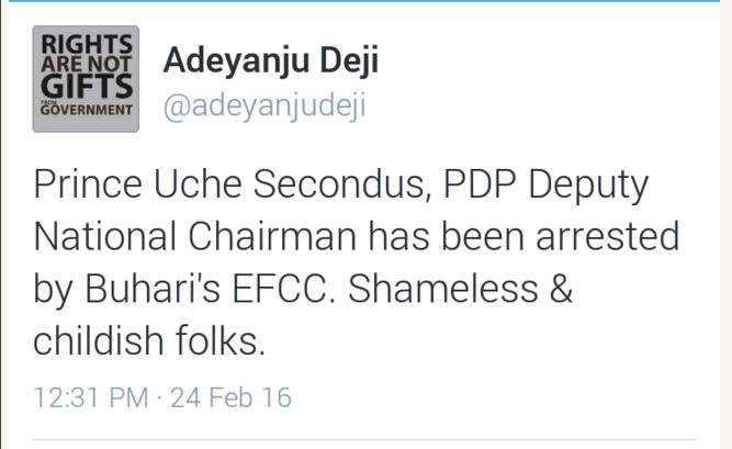 His arrest has been confirmed by the The director of New Media of the Peoples Democratic Party(PDP) Mr Adeyanju Deji on his Official Twitter Handle