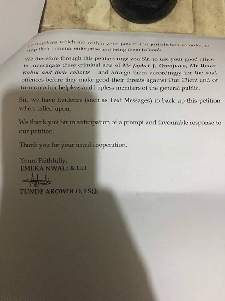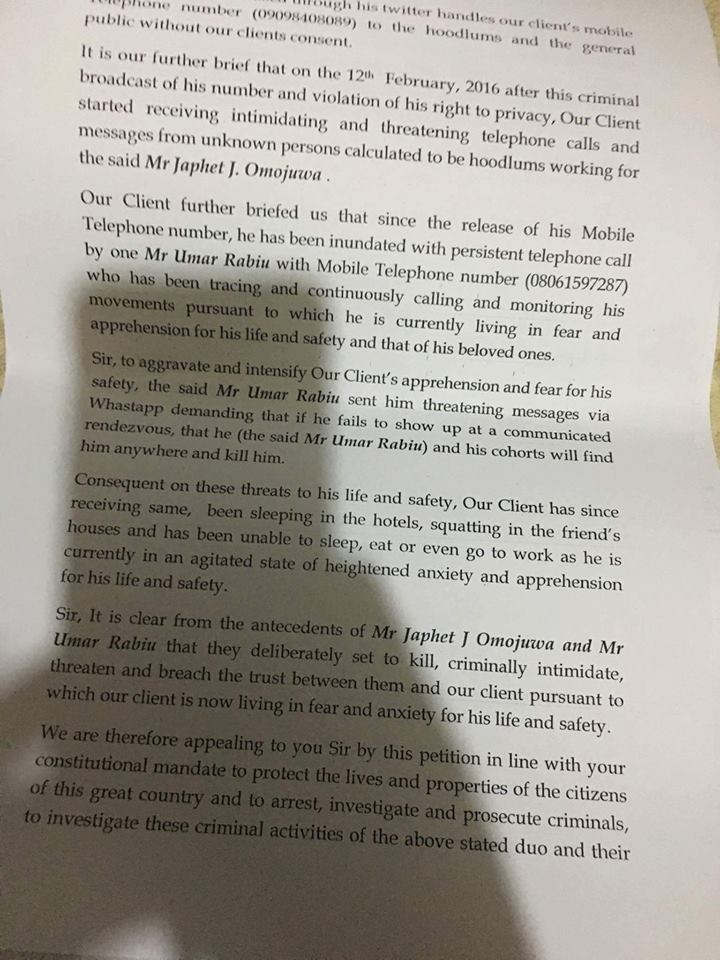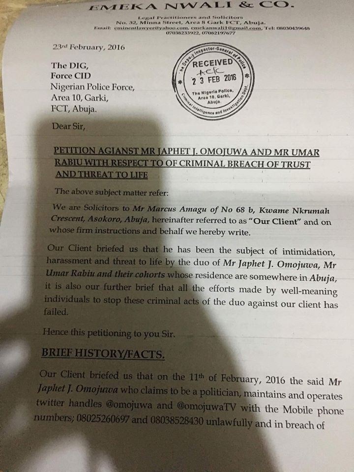 The Petitioner Mr Marcus Amagu through his Lawyer Emeka Nwali told the Nigeria Police in the Petition that since after the publication by Omojuwa,that a lot of threats has been sent to his Mobile Number by yet to be ascertained Individuals