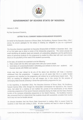 The Rivers State Sustianable Developement Agency(RSSDA) which is primary saddled with the responsibility of take care of all Students from Rivers State under the Sclorlarship programme introduced by the Immediate past Administration of Amaechi has through a letter directed all its Oversee Students to Return home to complete their Studies in Nigeria.