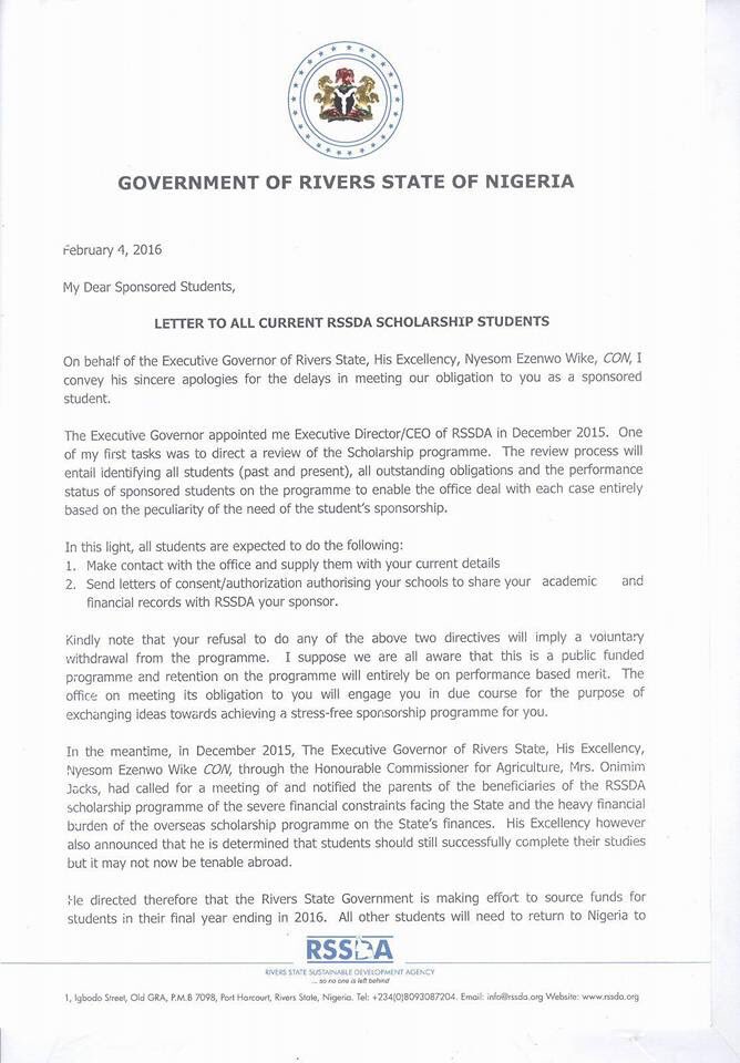 The Rivers State Sustianable Developement Agency(RSSDA) which is primary saddled with the responsibility of take care of all Students from Rivers State under the Sclorlarship programme introduced by the Immediate past Administration of Amaechi has through a letter directed all its Oversee Students to Return home to complete their Studies in Nigeria.