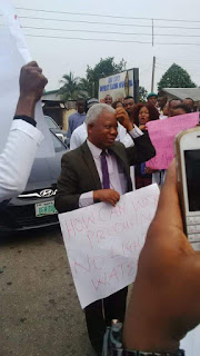 Provost of Abia State University Teaching Hospital (ABSUTH), Prof. Aluka carries placards as he addresses the protesting medical students alongside the president of Abia State University Medical Students Association.