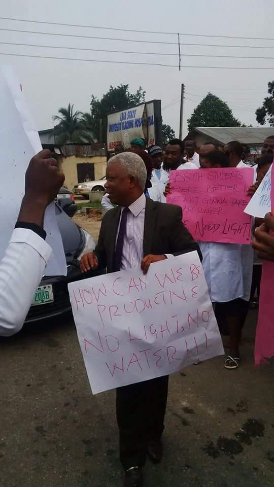 Provost of Abia State University Teaching Hospital (ABSUTH), Prof. Aluka carries placards as he addresses the protesting medical students alongside the president of Abia State University Medical Students Association.