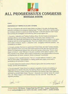 4. His antics betrays the present posture of Buhari’s regime which has cardinal virtues of honesty, sincerity and transparency 5. For conniving with Timipre Sylva in an attempt to destabilize the party and publishing an illegal statement on behalf of the party, the following officers are also placed on indefinite suspension following a motion moved by the Senatorial Vice chairman East, Elder Alagoa and seconded by comrade Marlin Daniel. They are: 1. Senatorial Vice Chairman Central, Mr. Joseph Fafi, 2. Mr. Edison Sorgwe, 3.. Mr. Panebi Fortune, Pub. Sec. and 4 Mr. Tonye Okio, the Organizing Secretary.