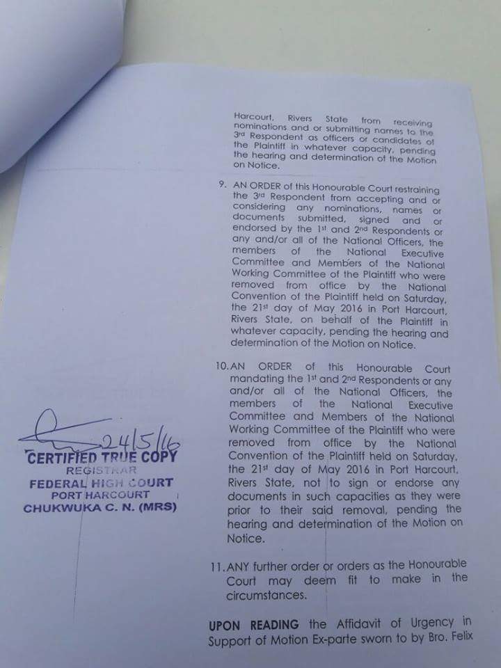 According to a statement personally signed by the presiding judge, Justice A. M. Liman, the court granted a restraining order on any member of the National Working