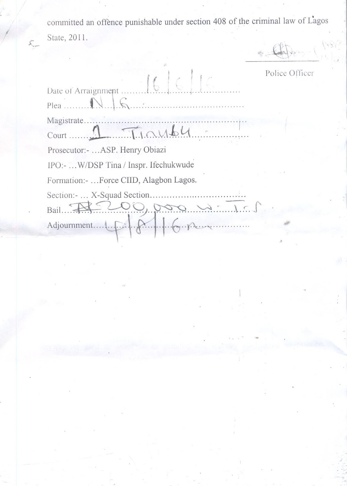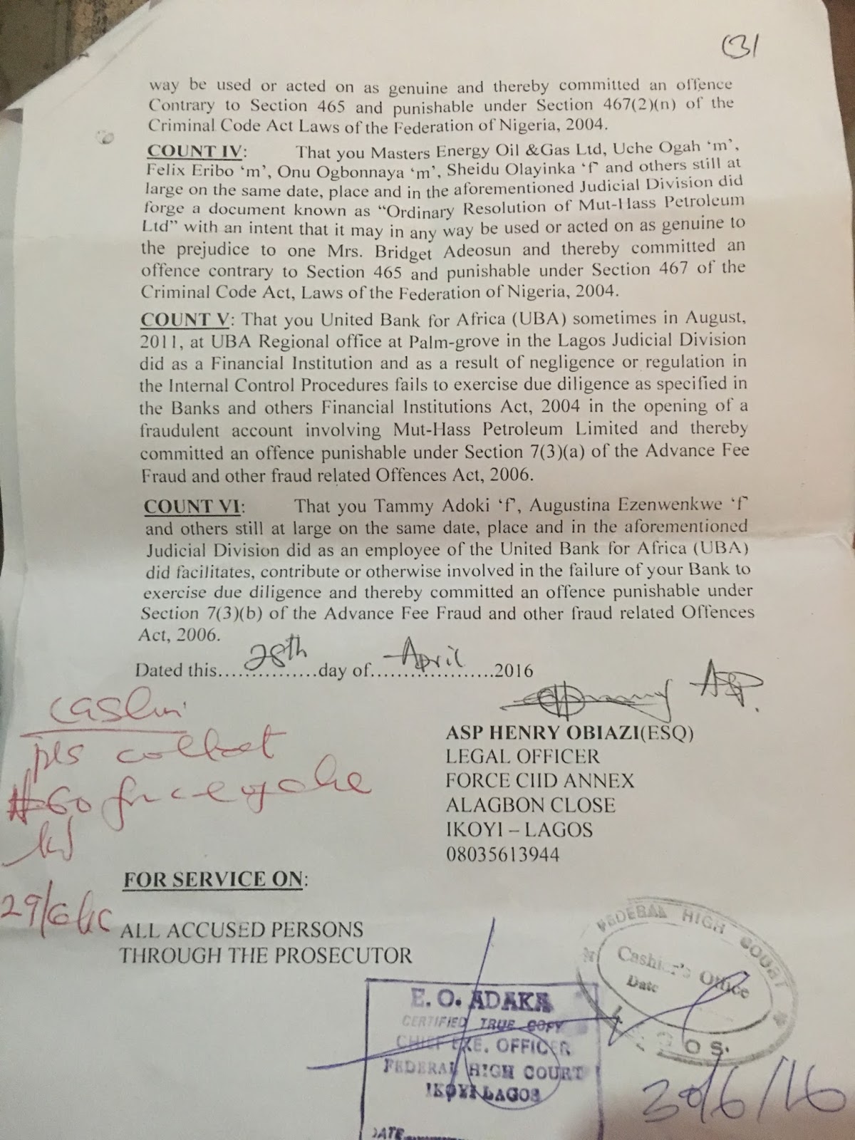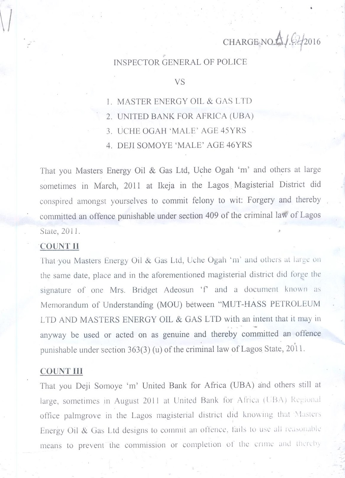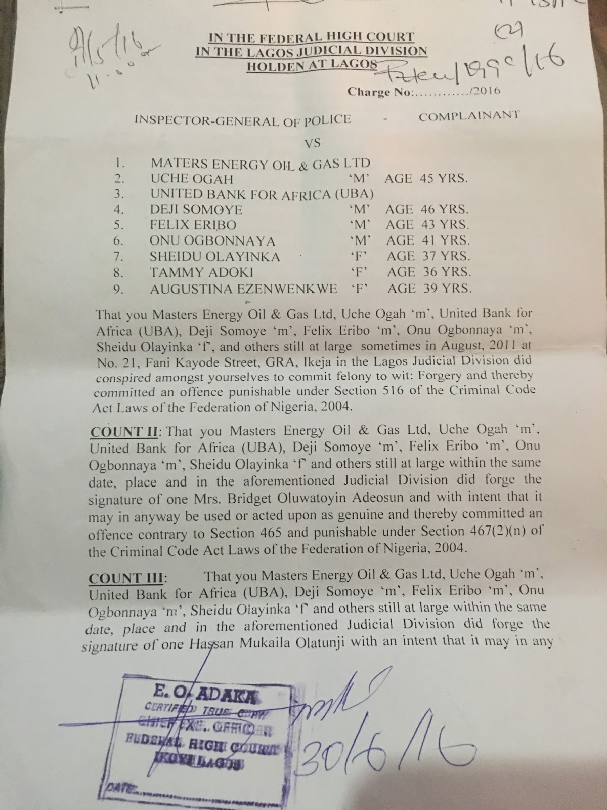The President of Masters energy oil gas Dr Uche Ogah who Justice Abang Okon of the Federal High Court Monday ordered to be sworn in as Abia State Governor is standing trial for forgery in Lagos
