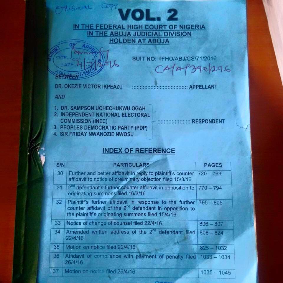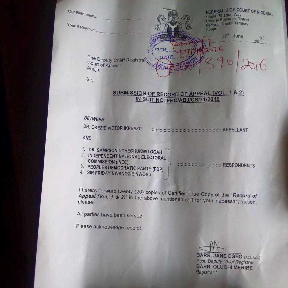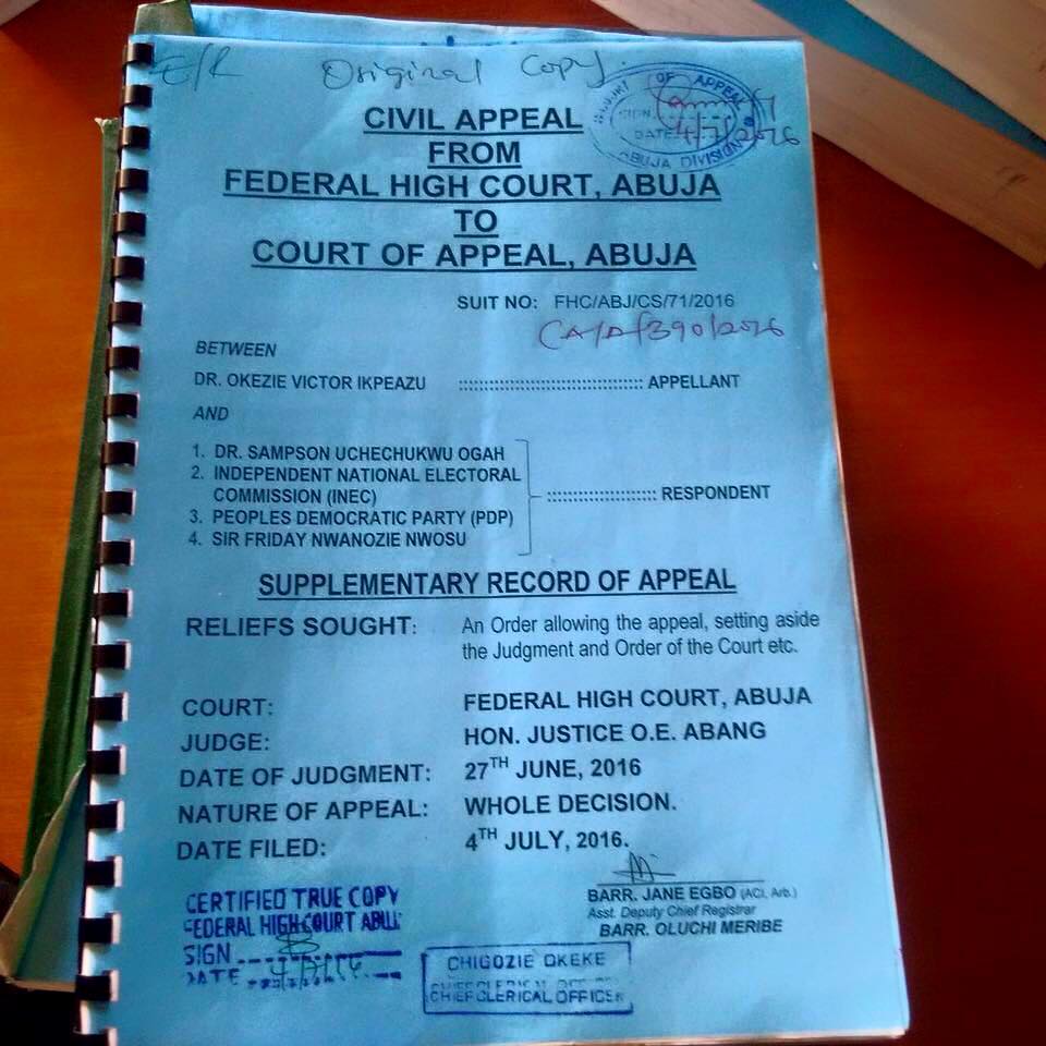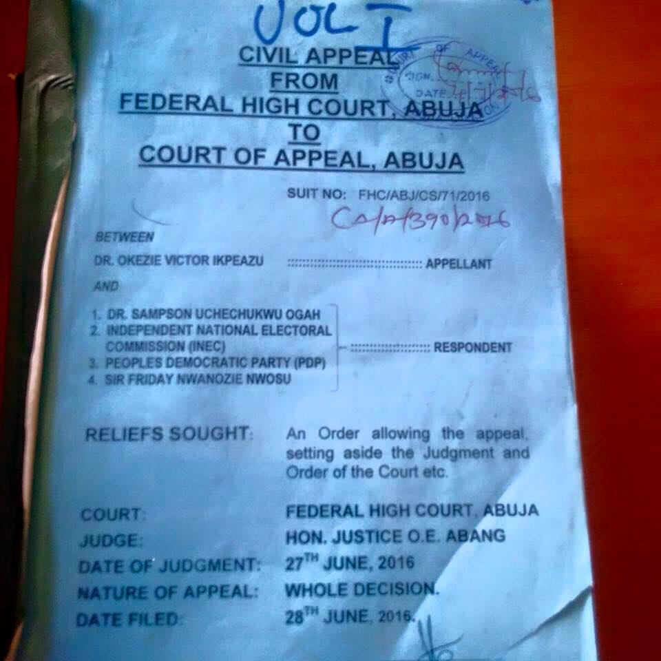 Abia State Governor Dr Okezie Ikpeazu has formally filed an Appeal against the Judgement of the Justice Abang Okon of the Federal High Court .