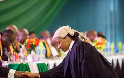 Wife of the President, Aisha Buhari, was at the morning session ceremony during which her daughter, Halima, who was part of the the first batch of 1,132 new wigs, were called to the bar.