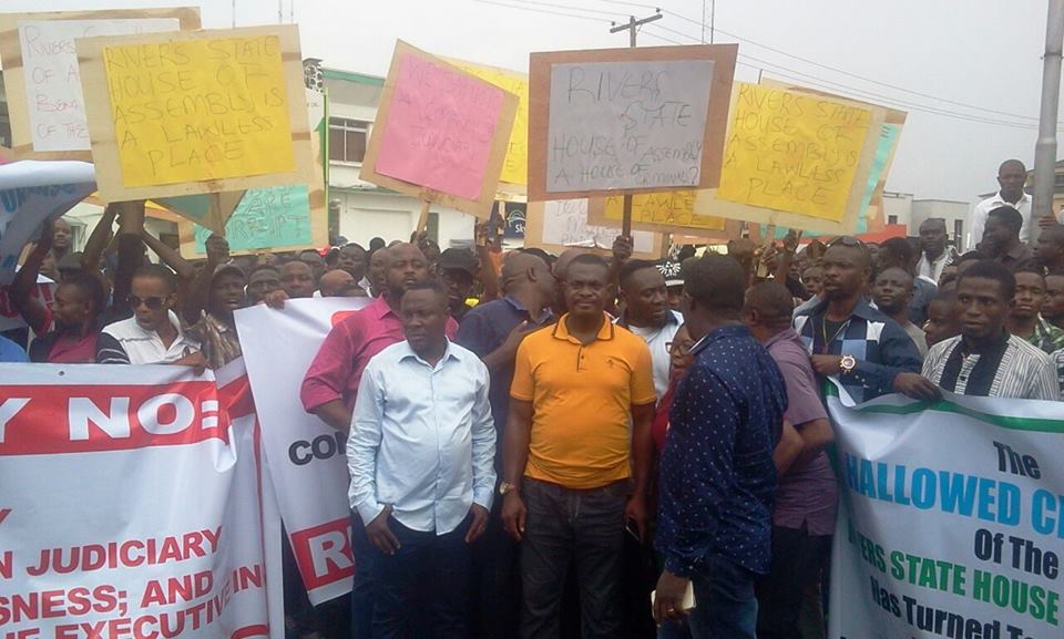 PUO METRO gathered that the APC Leaders not Civil Society Groups are protesting over the inability of the Rivers State House of Assembly led by Rt Hon Adams Daboturidinma has refused to Inaugurate the Appeal Court Declared winner of Phalga Constituency 2 Hon Victoria Nyeche and Mr Andrew Miller as a Lawmakers despite the fact that INEC had issued them with Certificate of Return.