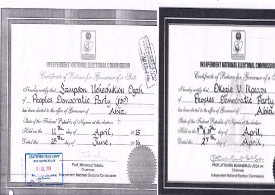 Here are two authentic CoR belong to President Buhari and Governor Ikpeazu issued by INEC.