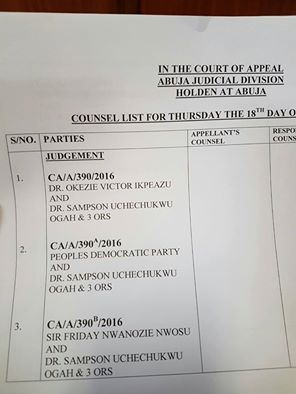 The Abuja Division Of the Court Of Appeal is set to Deliver Judgement on the Appeal filed by Governor Okezie Ikpeazu against the Judgement of the Abuja Division Of The Federal High Court which on the 27th of June 2016 asked him to Vacate Office For Dr Uche Ogah