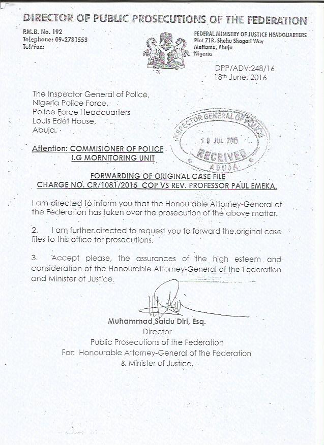 The Minister Of Justice and Attorney General of the Federal Republic Of Nigeria has written to the Nigeria Police Force to forward the Criminal Case File of Paul Emeka,a former General Superintendent of Assemblies Of God Nigeria who was alleged to have forged a University Of Derby Professorial Certificate.