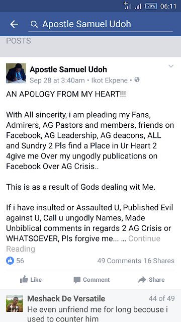Apostle Samuel Udoh,an ally of Paul Emeka in Akwa Ibom State has finally eating the humble pie and apologized to the Leadership of Assemblies of God Nigeria led by Rev Dr Chidi Okoroafor.