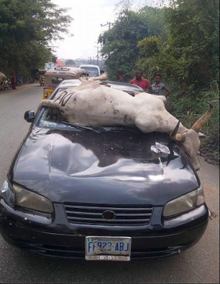 happened in 7UP, Aba. This cow jumped into this moving car carrying a man and his wife. Now you can see that Fayose’s action in passing and assenting to Anti Grazing Bill is in order.