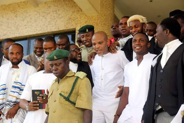 The Federal High Court Abuja was agog today as hundreds of Biafrans flooded the court premises from all corners of Biafra land and beyond to cheer and stand in solidarity with their leader, who arrived the court at about 9:45am, Biafra time, alongside co-defendants.