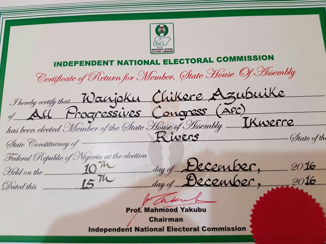 Member Elect Ikwerre State Constituency Hon Azubuike Chikere Wanjoku has been issued with his Certificate of return by the Independent National electoral Commission INEC.
