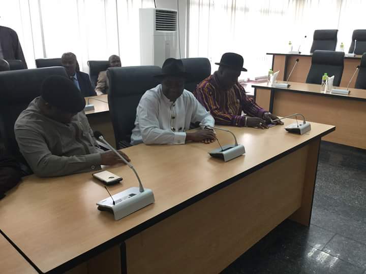 | From Right: Ossy Ideozu of the PDP,Magnus Abe of the APC and George Sekibo of the PDP seated at INEC Conference Center Abuja |
