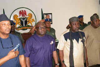 S-EAST GOVERNORS—From left, Deputy Gov. of Anambra State, Dr. Nkem Okeke, Governors Okezie Ikpeazu, Abia State, Rochas Okorocha, Imo State, and Ifeanyi Ugwuanyi, Enugu State at the South East Governors Forum in Enugu State, yesterday.