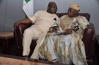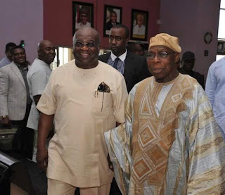 Abia State Governor, Dr Okezie Ikpeazu and former President of Nigeria, Chief Olusegun Obasanjo after an economic summit in Enugu today.