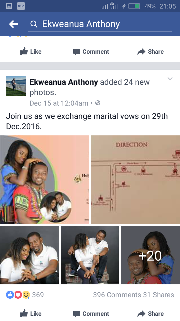 Due to recent unforseen circumstances, I have decided at this point not to continue with the proposed marriage ceremony for reasons best known to me. Deeply sorry for any inconveniences caused. Thanks. Merry Christmas and a happy new year. Ekweanua Izuchukwu Anthony” He posted on his Wall.