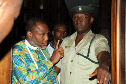 ARRAIGNED: Mr. Nnamdi Kanu, detained leader of the Indigenous People of Biafra, IPOB, with a Prisons official, at the premises of a Federal High Court in Abuja, yesterday.