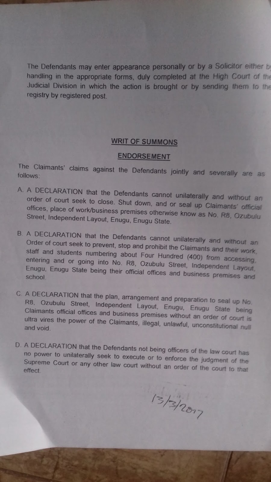 In the fresh case filed before Justice R.N. Onuorah, with suit No E/101/2017, Emeka is seeking among other things “as order of interlocutory injunction restraining the defendants, either by themselves or their servants, agents, privies, assigns, subordinates or any person or persons, howsoever called from interfering in any way or manner howsoever with the claimants’ use of No R8 Ozubulu Street, Independence Layout, Enugu, Enugu State, being the claimants’ official offices, business premises and in particular restraining the defendants from sealing up the aforesaid premises and from disturbing, preventing and or denying the claimants and their staff and students access to the said No R8 Ozubulu Street, Independence Layout, Enugu, Enugu State to carry out their lawful duties and obligations as officers of the Assemblies of God, Nigeria pending the determination of the substantive suit.”