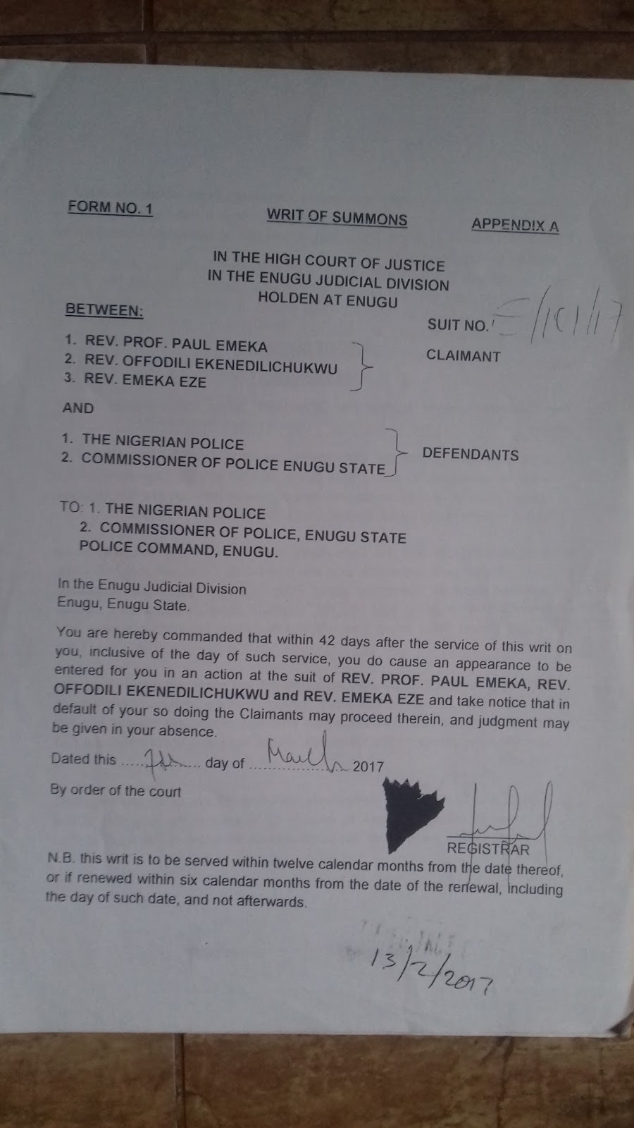 The suit has Rev. Prof. Paul Emeka, Rev. Ofodile Ekenedilichukwu and Rev. Emeka Eze as plaintiffs. Joined as defendants are the Nigerian Police and the commissioner of police Enugu State.
