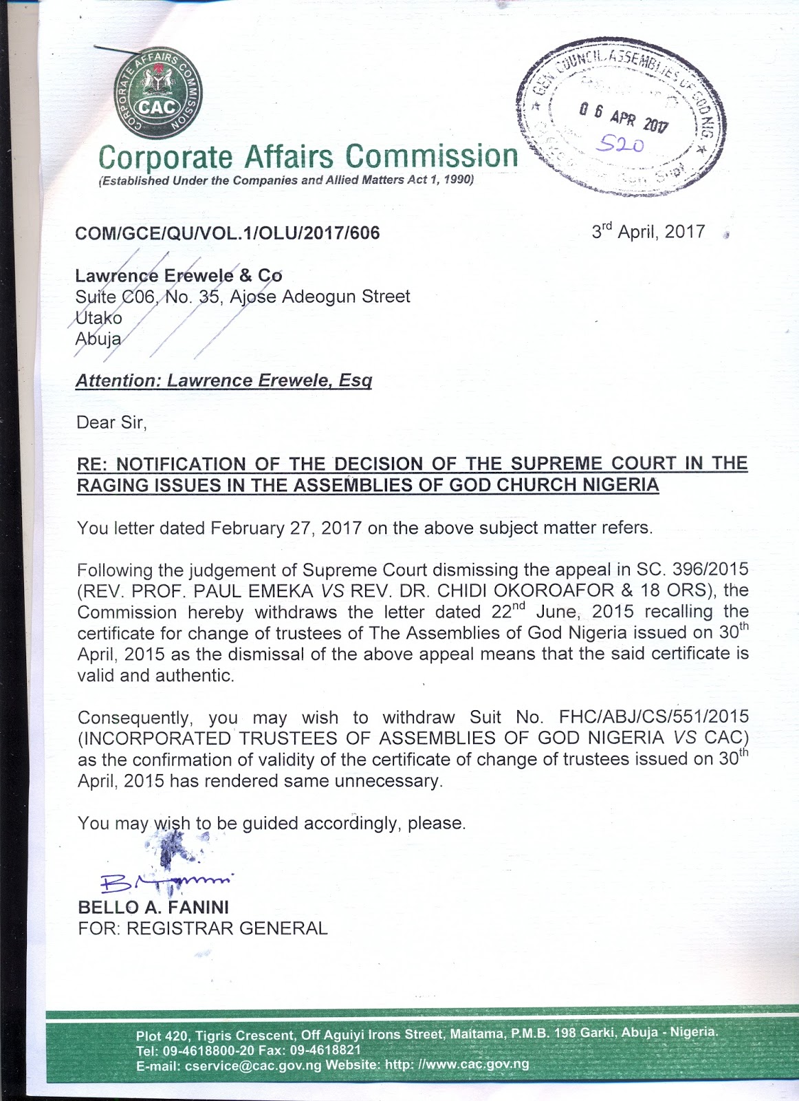 In a letter dated 3rd April and signed by Mr Bello A Fanini for Registrar General of the Commission and addressed to Barr Lawrence Erewele,one of the Lawyers to Assemblies Of God Nigeria,the Corporate Affiars said it has withdrawn the letter dated 22nd June 2015 recalling the Certificate for change of Trustees of The Assemblies Of God Nigeria issued on 30th April 2015 as the Dismissal of Rev Paul Emeka’s Appeal by the Supreme Court,means that the Certificate given to Assemblies Of God Nigeria is valid and authentic.
