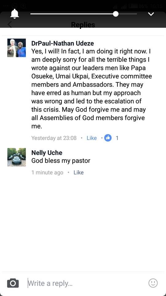 Although the apology of Nathan Udeze is not going down well with some followers of Paul Emeka,it is clear that the Former Youth Director has made up his mind to return to embrace the Olive Branch given by the Leadership of Assemblies Of God Nigeria.