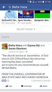 Members of the Indigenous People of Biafra has cancelled planned Invasion of Assemblies Of God Church 222 Clifford Road Aba in Aba District.