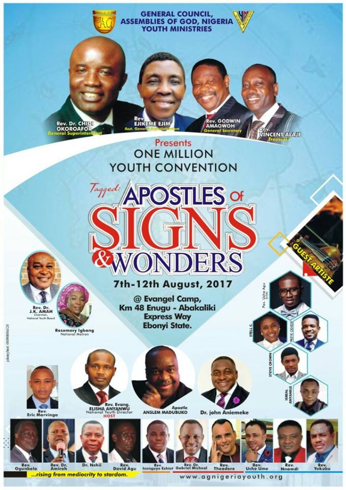 The 2017 National Youth Convention is with the Theme”Apostles Of Signs and Wonders” and it shall be hosting One Million Assemblies Of God Youths.