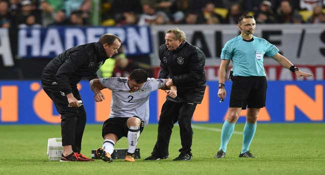 The centre-back pulled up with what looked like a thigh injury on 36 minutes and hobbled off the pitch, helped by Germany’s medical staff.