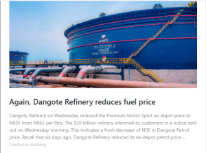Last week became the second time the $20 billion refinery slashed its fuel price statewide. This suggests a total ex-depot price decrease of N45 per liter.