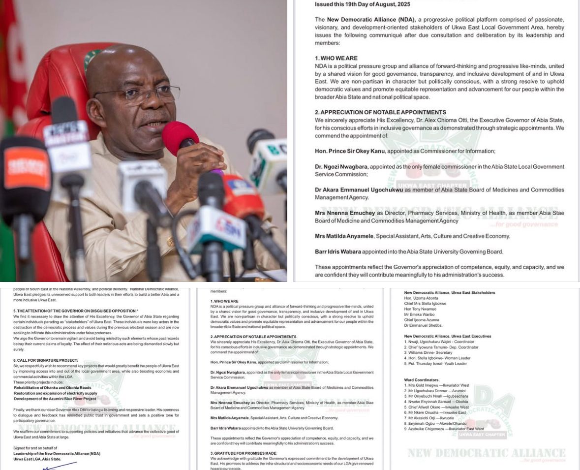 The New Democratic Alliance (NDA), a progressive political platform of visionary and development-oriented stakeholders in Ukwa East Local Government Area, has passed a vote of confidence on the Governor of Abia State, Dr. Alex Chioma Otti, over what it described as his exceptional governance style.