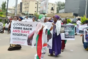 The demonstrators, carrying placards with inscriptions such as “Goodluck come back and save Nigeria,” marched to the national headquarters of the Peoples Democratic Party (PDP), where the party’s National Executive Committee was holding a meeting.