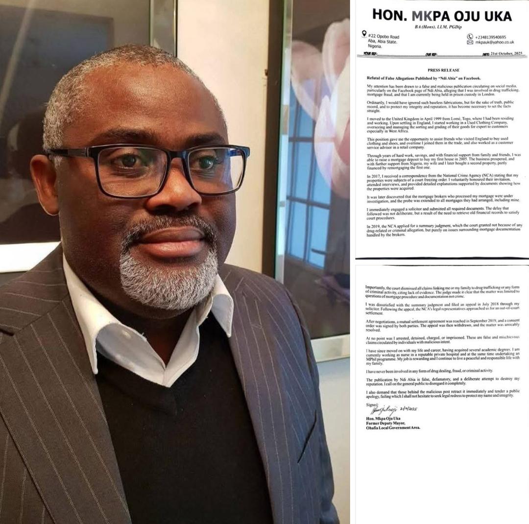 Former Deputy Mayor of Ohafia Local Government Area, Hon. Mkpa Oju Uka, has dismissed as false and malicious the social media report alleging that he was involved in drug trafficking, mortgage fraud, and is currently in prison custody in London.