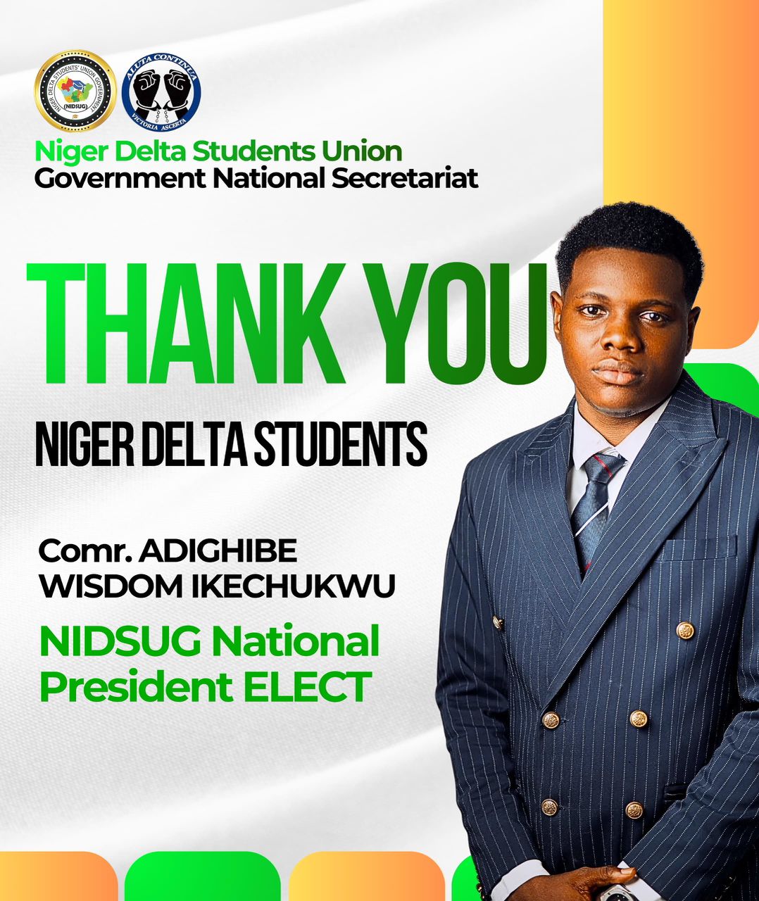 Adighibe Wisdom Ikechukwu, from Obingwa Local Government Area of Abia State, emerged victorious following a keenly contested, free and fair election held in Port Harcourt, Rivers State, marking a historic milestone for the South-East within the Niger Delta student leadership structure.