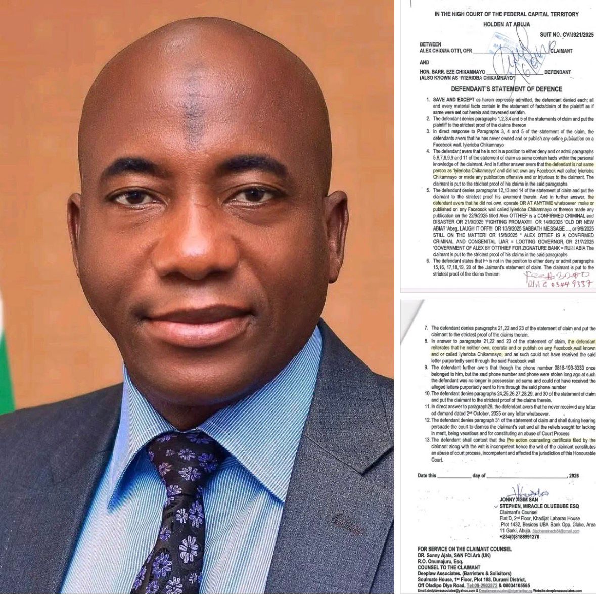 In a Statement of Defence filed before the High Court of the Federal Capital Territory, Abuja, in Suit No. CV/3921/2025, Barrister Chikamnayo categorically disassociated himself from the Facebook handle “Iyierioba Chikamnayo,” which is accused of making several allegations of fraud and criminality against the Governor.